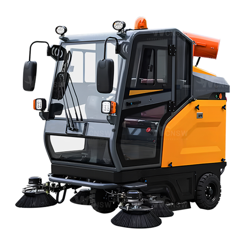 It is a high-power electric enclosed sweeping machine featuring a dual-fan, dual-filter, dual-dust vibration system. It has a large filtering area and achieves automatic dust vibration, resulting in excellent cleaning performance and high efficiency. It comes standard with a 48V 200Ah battery for long working time. Equipped with a 4KW high-pressure washing and fog cannon, it can wash waste bins, remove small advertisements, and perform dust suppression. The large water tank can meet the needs of long-term spraying and washing operations, making it suitable for various cleaning tasks.